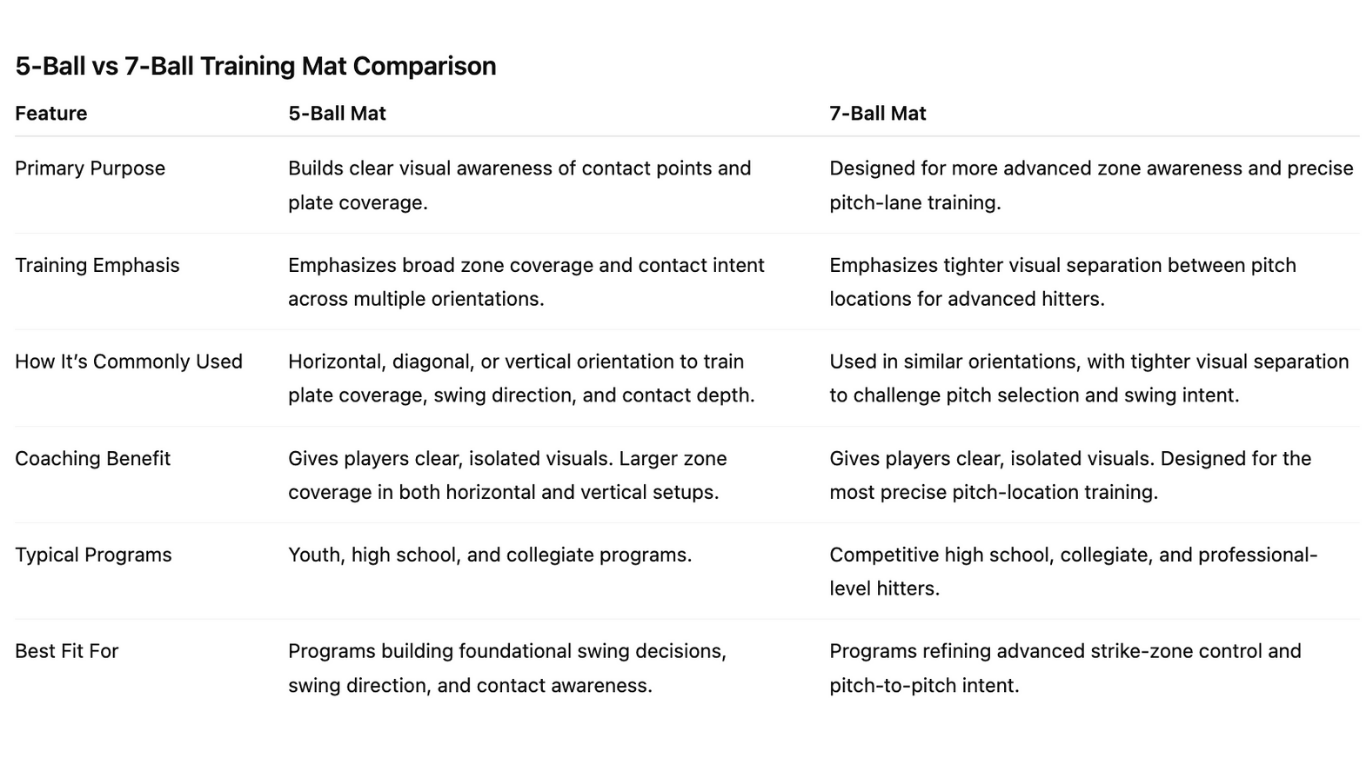 The 5-Ball Mat builds and challenges contact-point awareness and swing direction, while the 7-Ball Mat adds expanded zone specificity for advanced hitters.